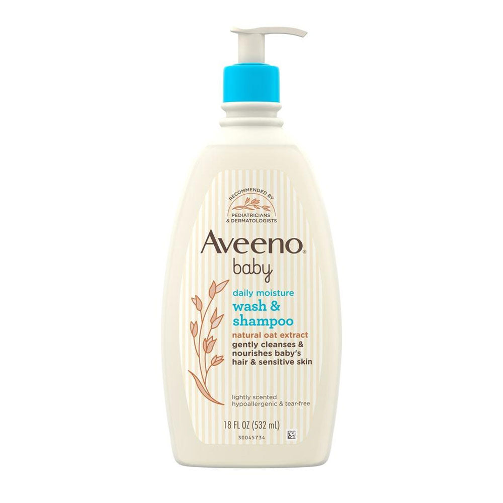 Aveeno Baby Daily Moisture Wash & Shampoo 18 oz/532 ml is a pediatrician-recommended, tear-free, 2-in-1 formula with natural oat extract for cleansing sensitive hair and skin. Soap-free and hypoallergenic, it offers a gentle, lightly scented lather suitable for daily use on newborns and infants