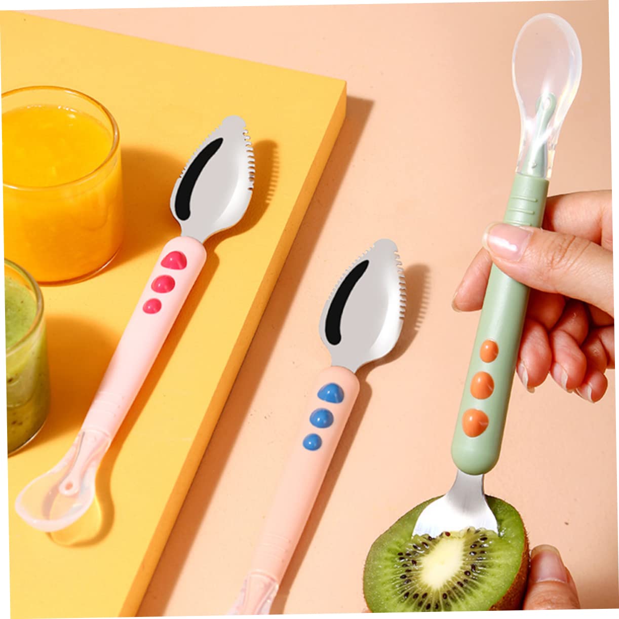 Designed to be a double-ended spoon that has a stainless steel end with serrated edges and silicon end on the other side, which is used for catching the mash. Silicon edge is made as gentle as possible for the baby's delicate gums. It helps parents feed toddlers conveniently and cleanly.