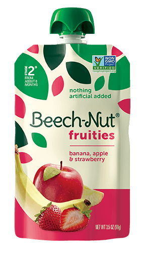 Beech-Nut Baby and Toddler Food Pouches are made with real ingredients and packed in convenient pouches for on-the-go feeding. Our fruities blend contains apple, peach and strawberries–a delicious way to squeeze more fruits into your little one’s day. This Stage 2 puree is ideal for your baby 6 months and up.