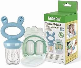 The Haakaa Freeze-N-Feed Mini Combo is a silicone set designed for safely introducing solid foods and providing soothing relief for teething infants. The combo includes a soft-pouch fresh food feeder and a mini freezer tray for making perfectly portioned frozen treats.