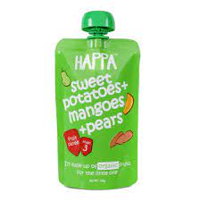 SWEET POTATOES+MANGOES+PEARS PUREE: Grr! Is that your little tummy growling? Hello there, I am Happa's yummy-licious trio of three tasty foods - sweet potato, mango and pear! My taste is so good that once you try me, you won't stop smacking your lips. I was made safely, simply and carefully just like homemade food.
