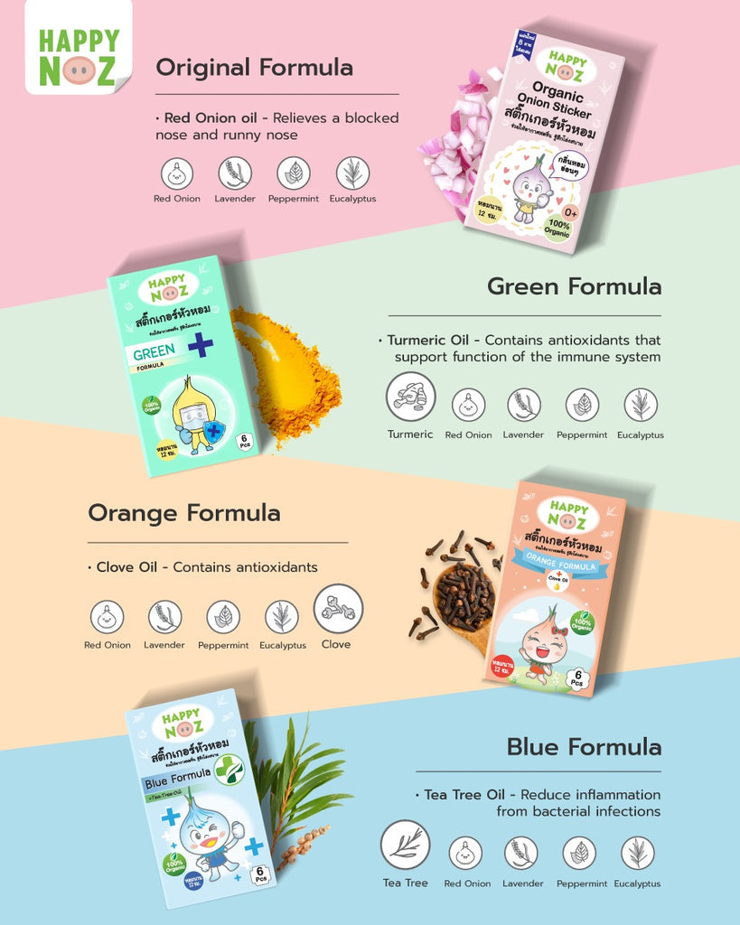 Happy Noz Onion Stickers Helps to freshen the nose, clear breathing, works up to 12 hours. For viral infections, colds, allergies, stuffy nose (clear phlegm/ snot) Organic 100% Key ingredient "Onion sticker" helps to refresh the nose. Onion oil - helps relieve stuffy nose and runny nose, relieves nasal congestion and mucus Eucalyptus oil - helps to breathe fresh feeling Lavender oil - helps relax, sleep well Peppermint oil - helps to prevent allergy, runny nose, stuffy nose Contains 6 pcs per box Last up to 12 hours