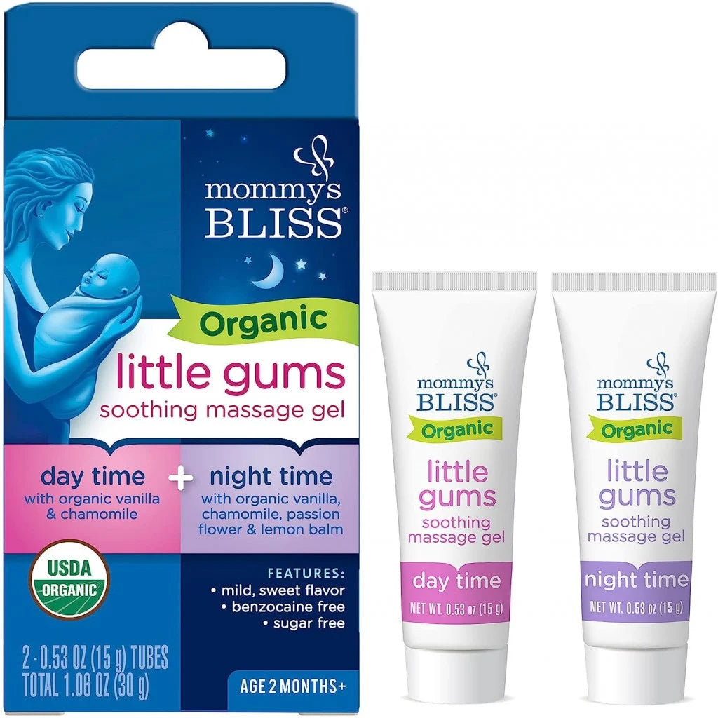 Mommy’s Bliss® Organic Little Gums Soothing Massage Gel contains two easy squeeze tubes - a day time use product containing organic vanilla and chamomile, as well as a nighttime use product which has added passion flower and lemon balm. Mommy’s Bliss® Organic Little Gums Soothing Massage Gel has a sweet, mild flavor to help soothe your baby’s gums. This USDA certified organic formula is Benzocaine and Belladonna free. Plus, there's no added sugar, no alcohol, no artificial flavors or colors, and it’s free of the top 8 allergens.