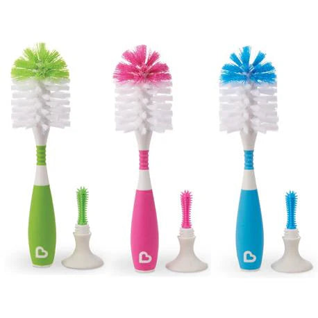 The Munchkin Bristle Bottle Brush features a patented suction cup base, so when scrubbing is done, you simply pop it onto the countertop to keep it upright, fast-drying and away from germs. The non-slip handle gives soapy hands a firm grip and the sturdy nylon bristles are tough on dirt, yet gentle on baby's bottles